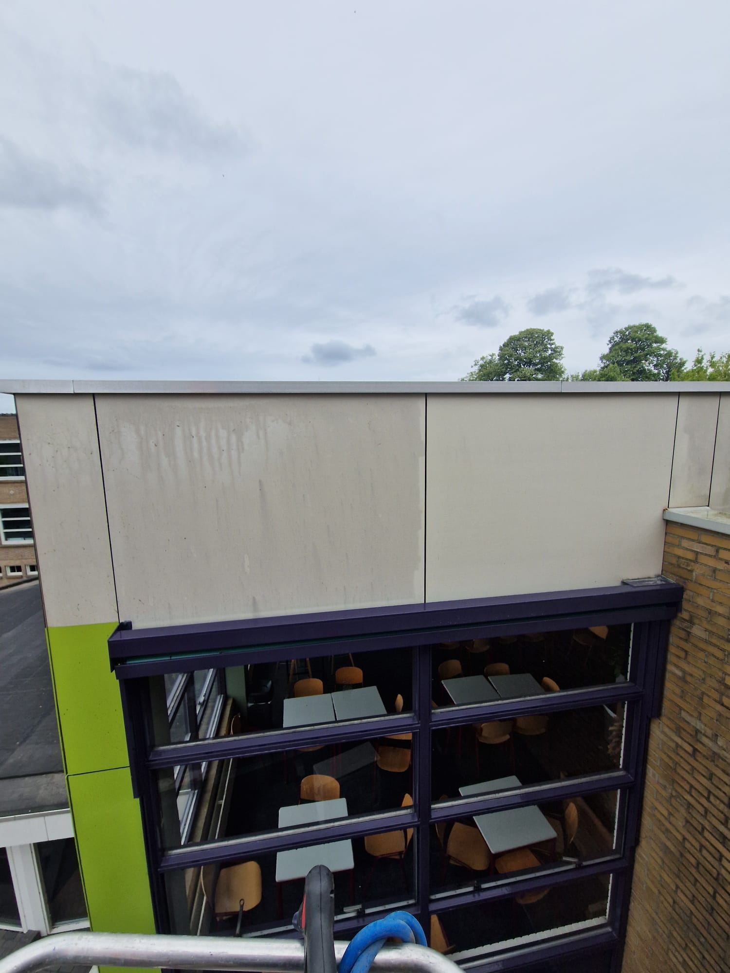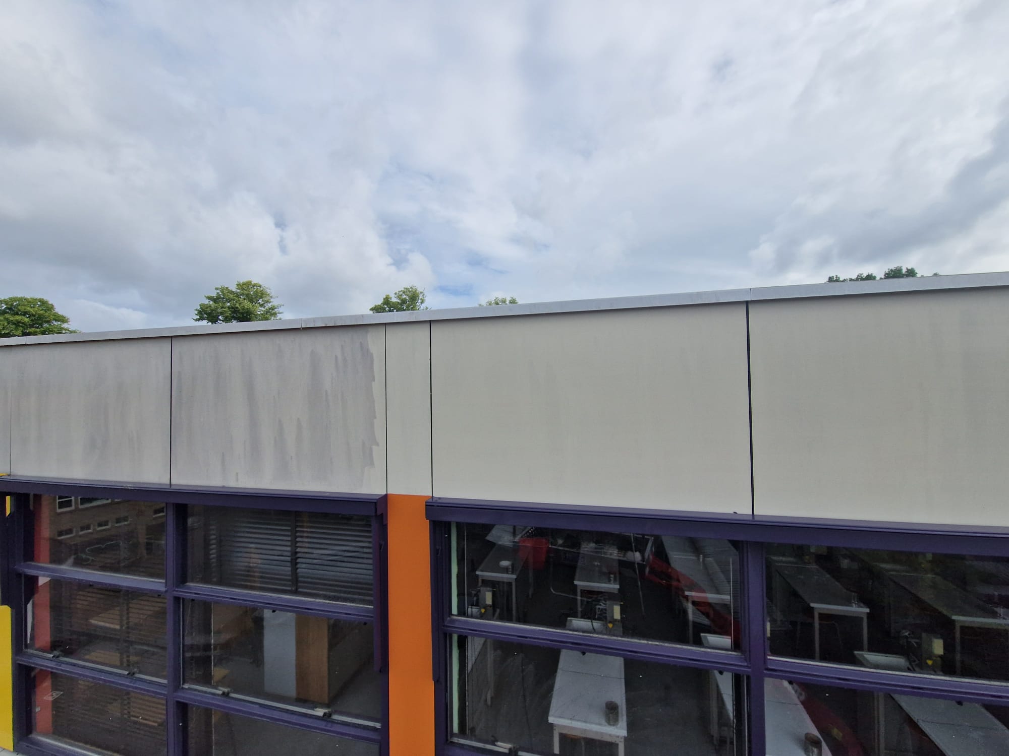 In Bergen op Zoom hebben wij bij een school de Trespa-gevelpanelen grondig gereinigd. Door de jaren heen waren de panelen vervuild geraakt door aanslag, weersinvloeden en luchtvervuiling. Dit gaf het pand een vale en verouderde uitstraling.